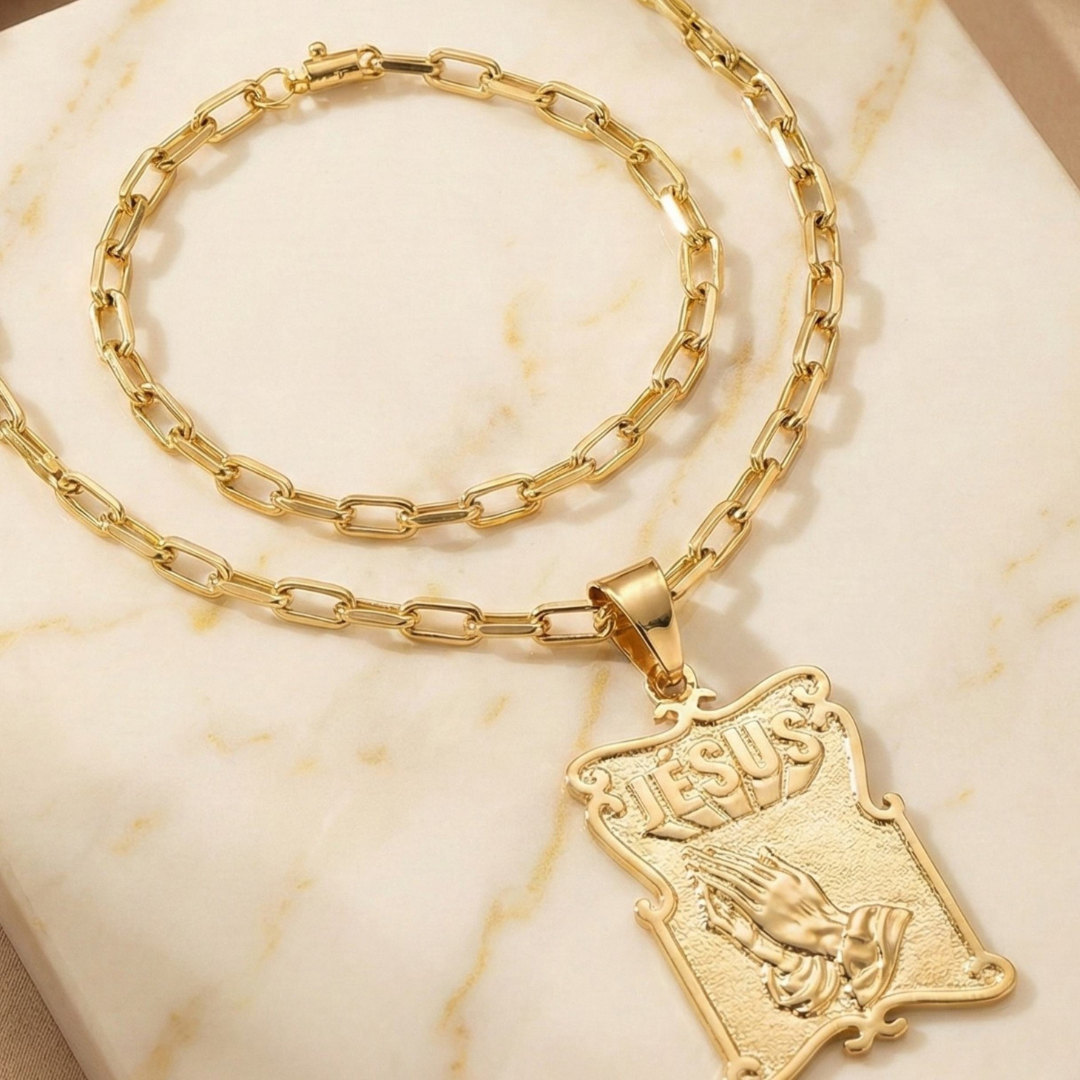 Elle est sublimée par un pendentif mains en prière de 4 cm, symbole universel de protection, d’humilité et de spiritualité